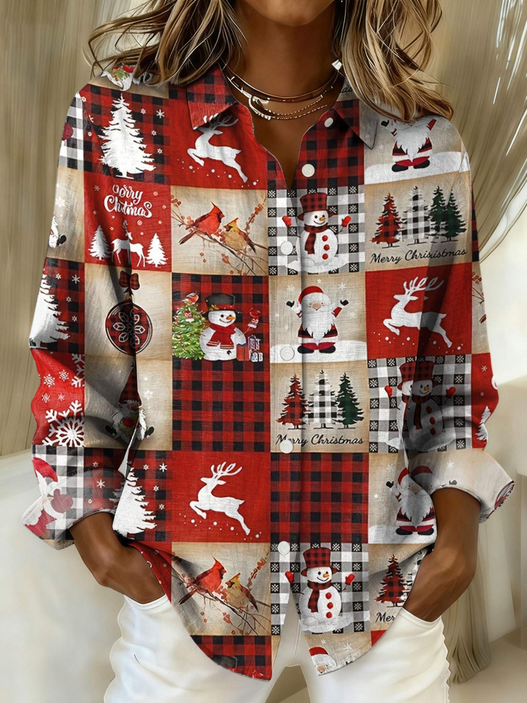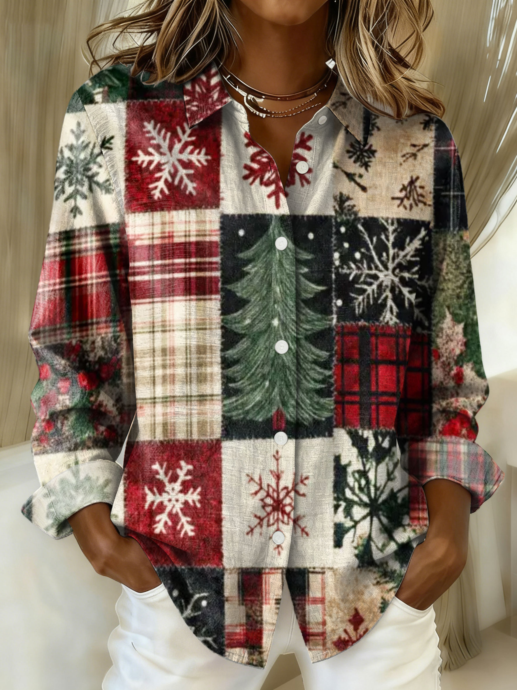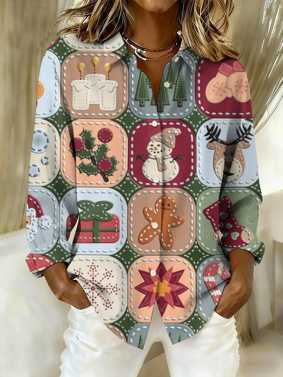 Christmas Patchwork Art Print Casual Cotton Shirt