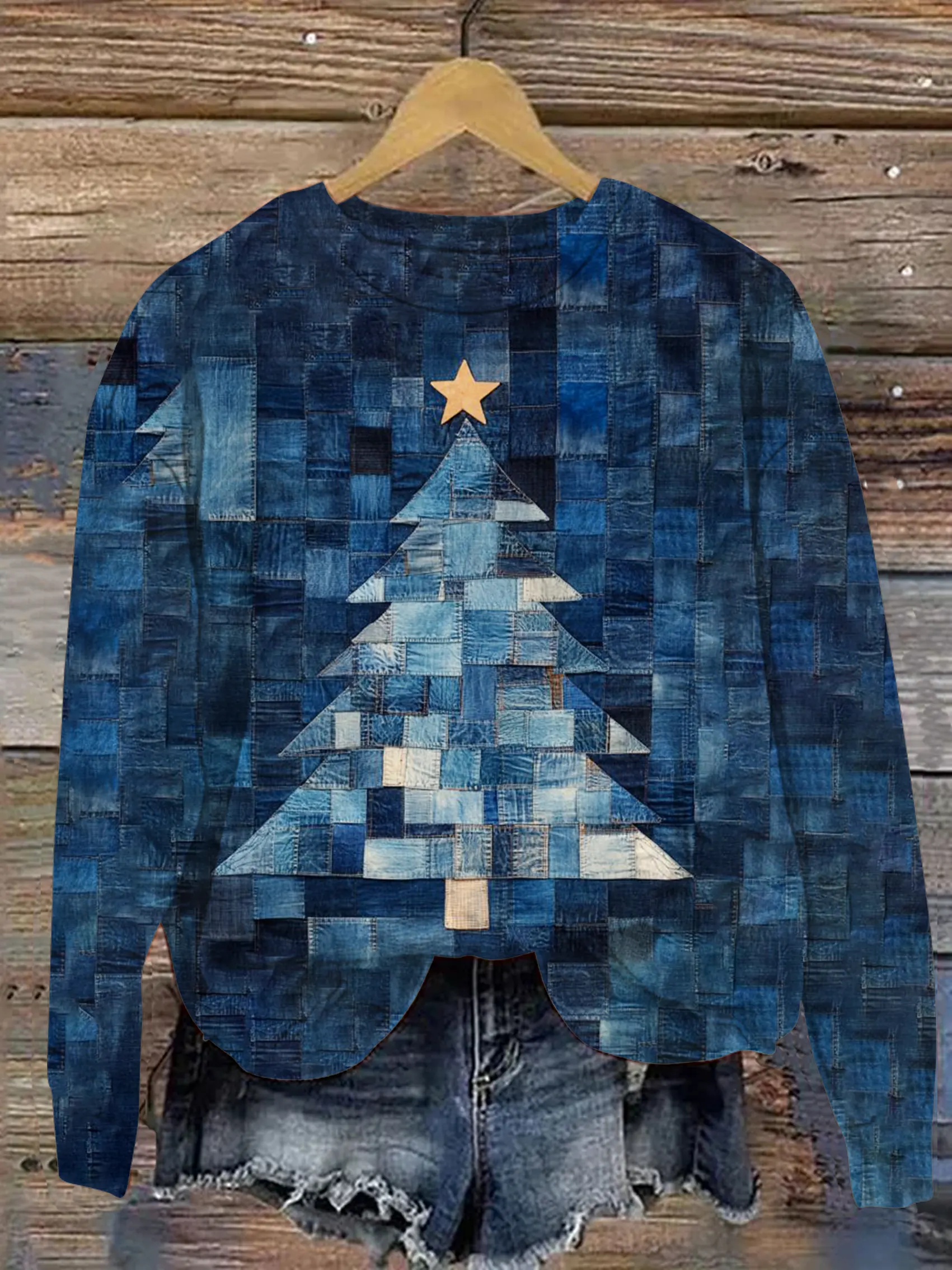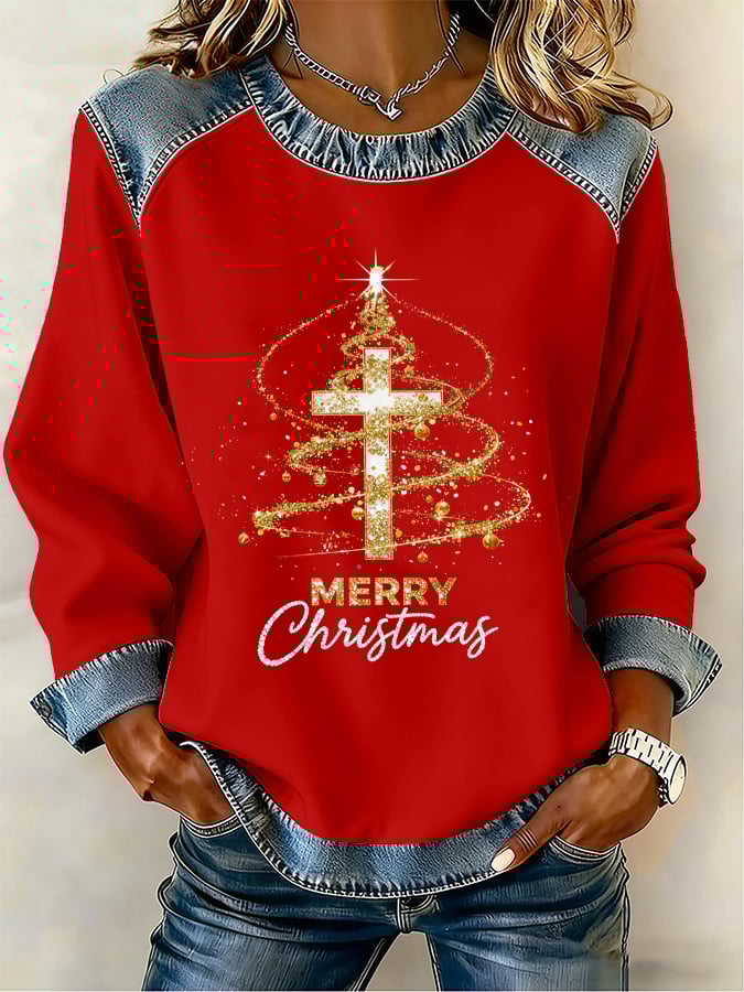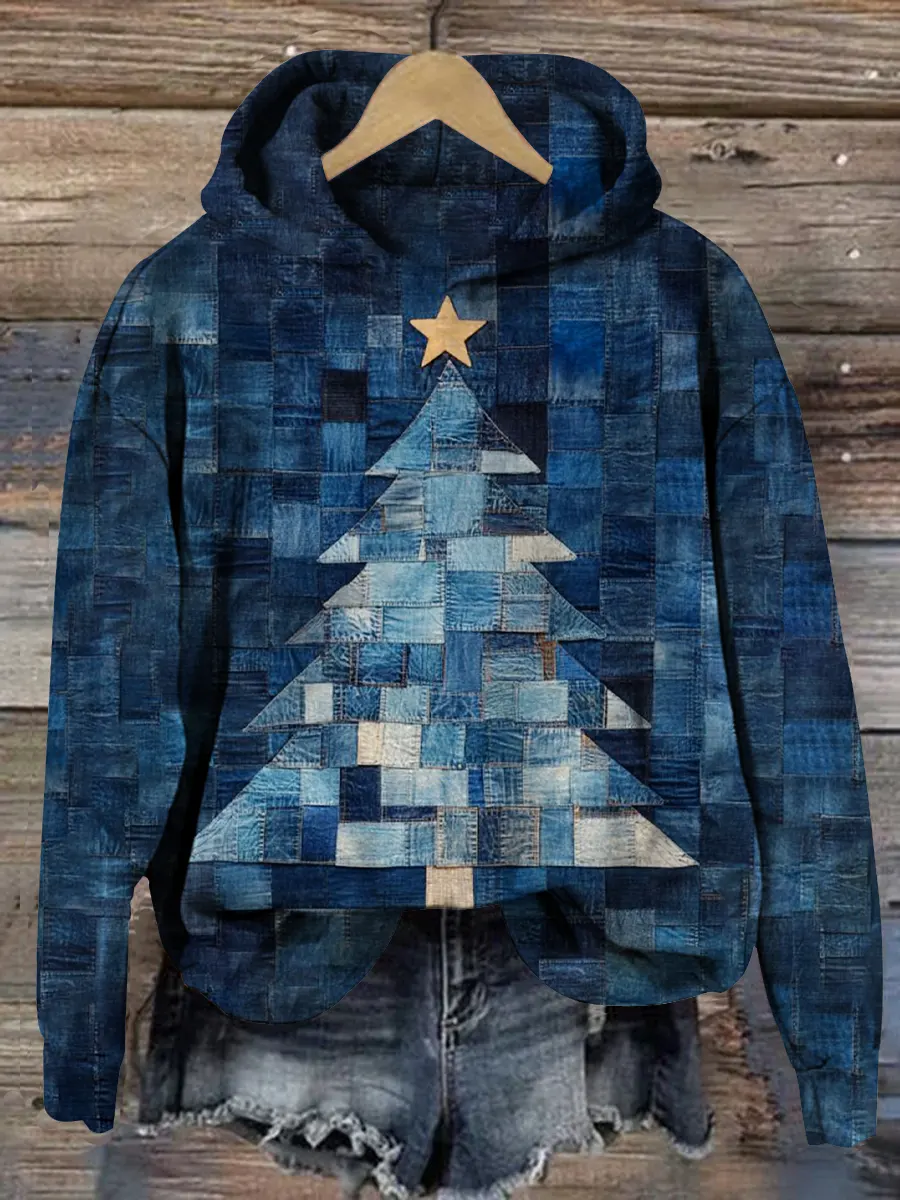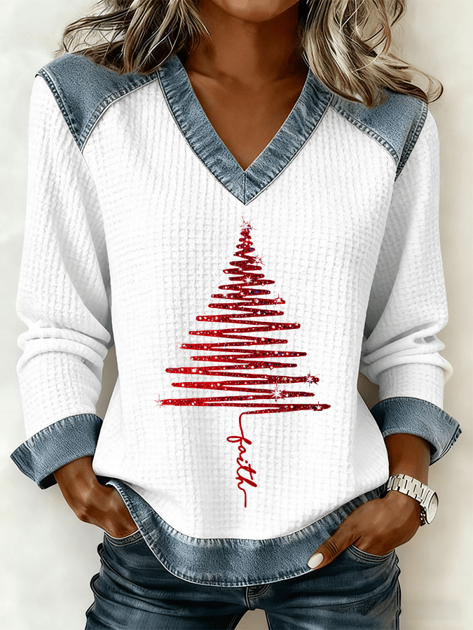 Women's Christmas Tree Print Waffle Casual Patchwork Denim Sweatshirt