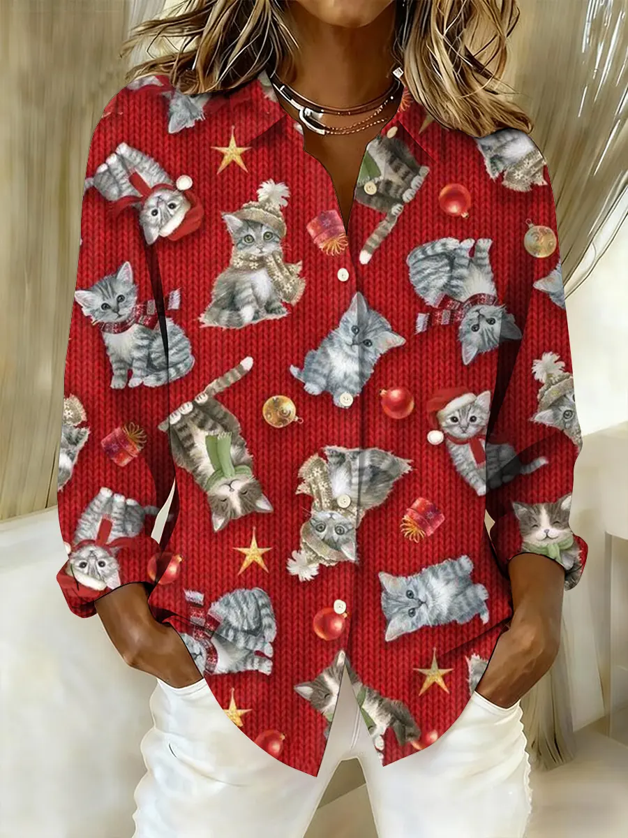 Retro Christmas Cat Art Cotton Long Sleeve Shirt