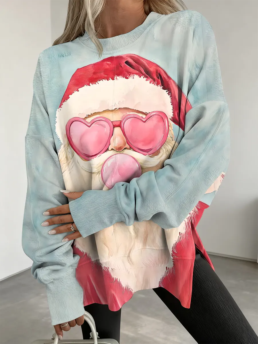 Retro Santa Claus Art Print Casual Slit Long Sleeves Sweatshirt