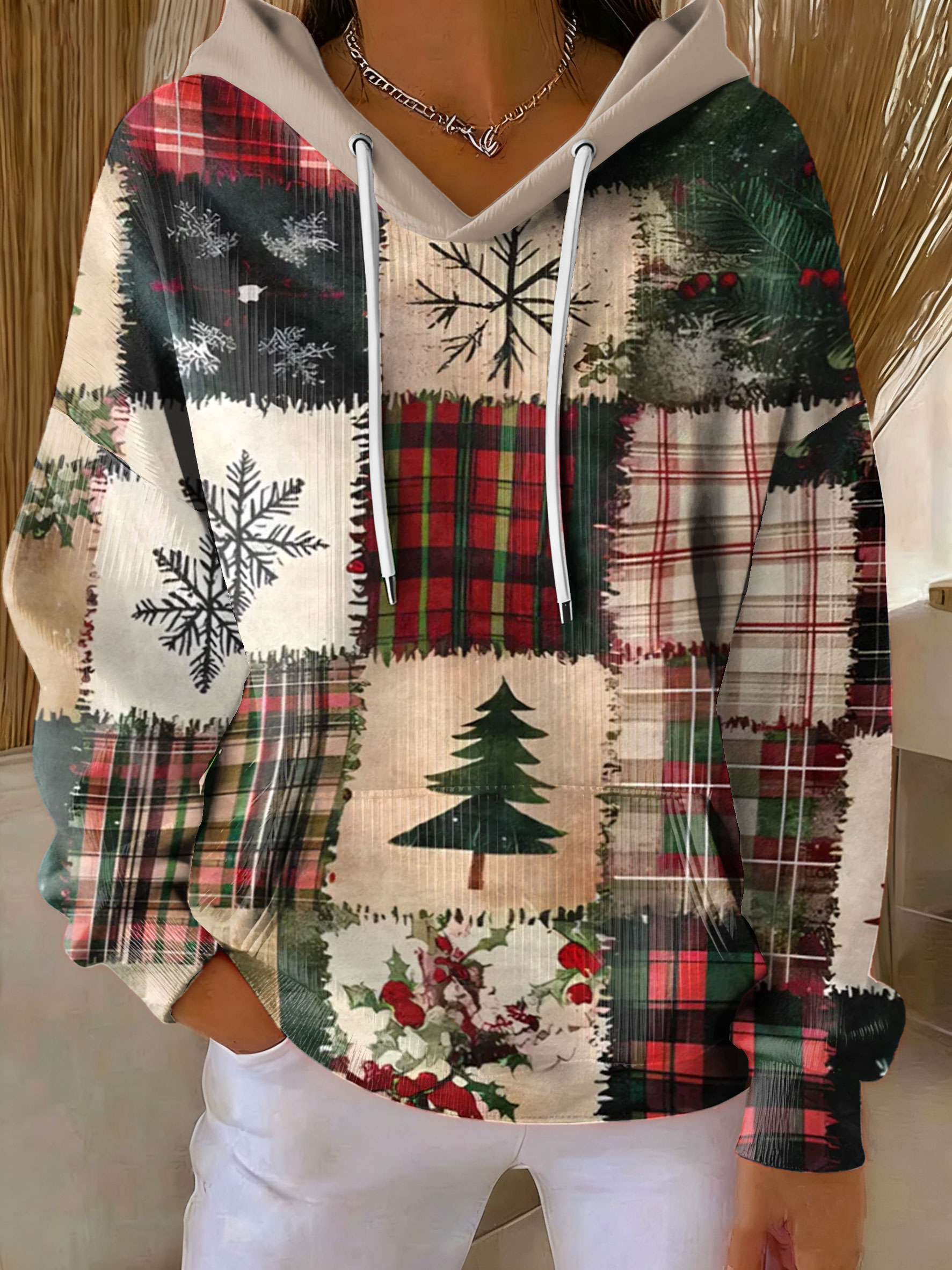 Vintage Christmas Patchwork Art Casual Hoodie Sweatshirt