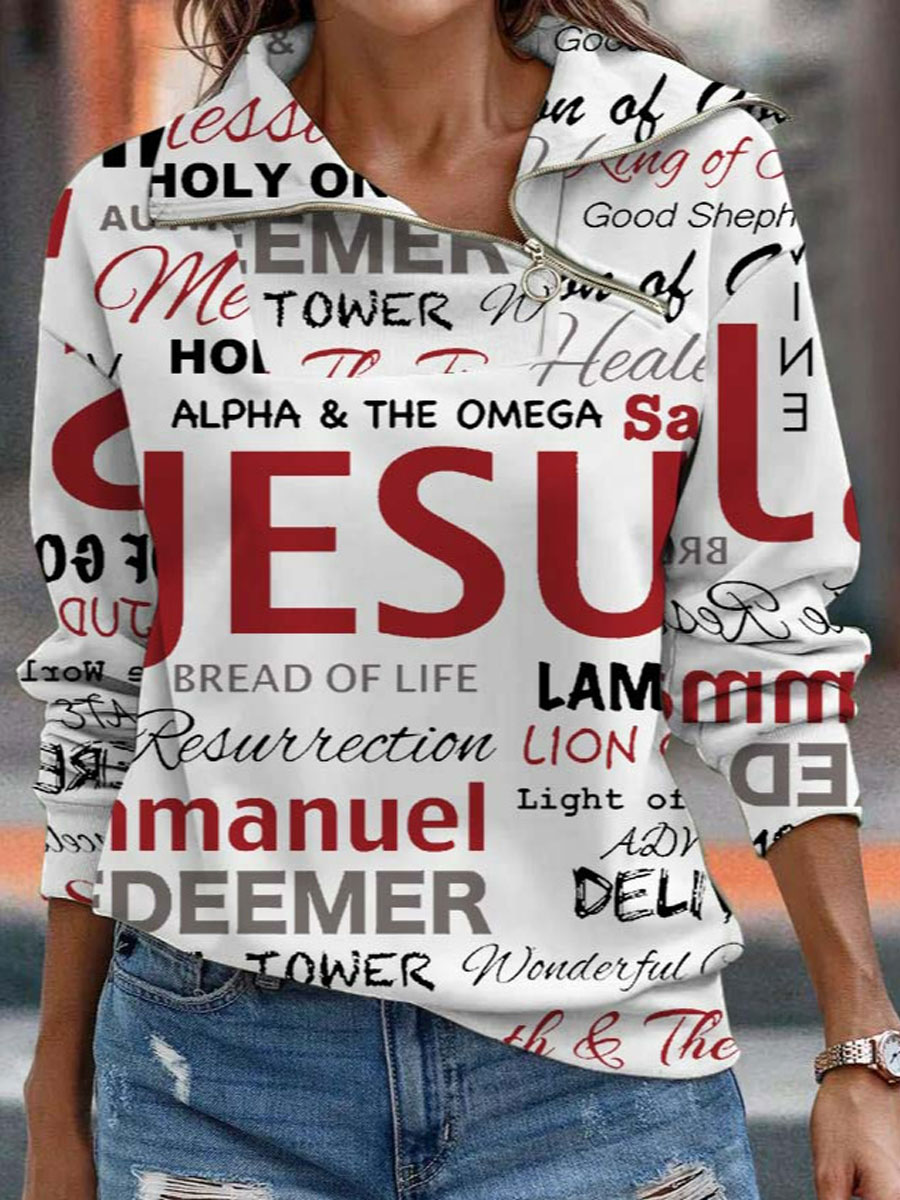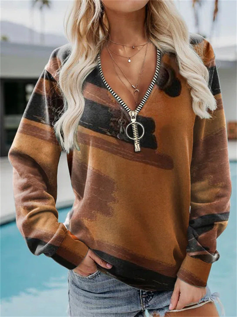 V-neck Zip Casual Loose Vintage Print Sweatshirt