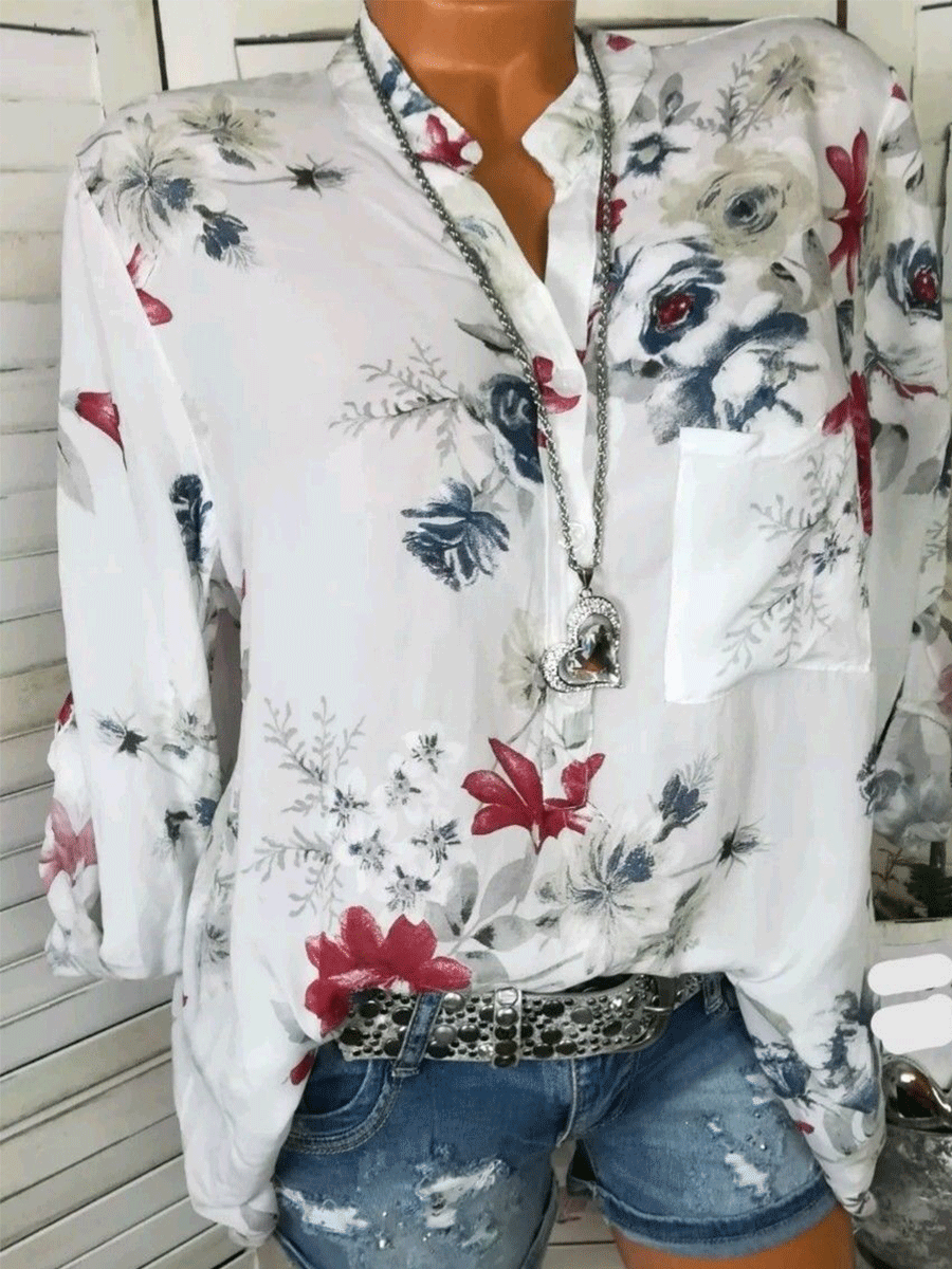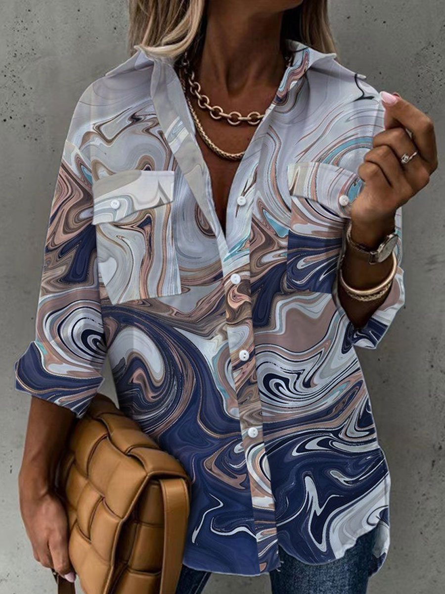 Round Neck Casual Loose Printed Hollow Long Sleeve Blouse