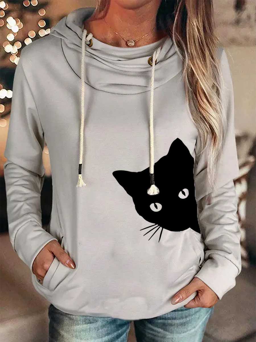 Casual Cat Print Long-Sleeved Hooded Sweatshirt
