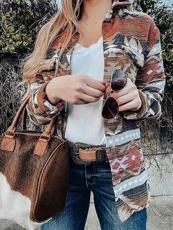 Women's Coats Retro Geometric Print Long Sleeve Woolen Coat