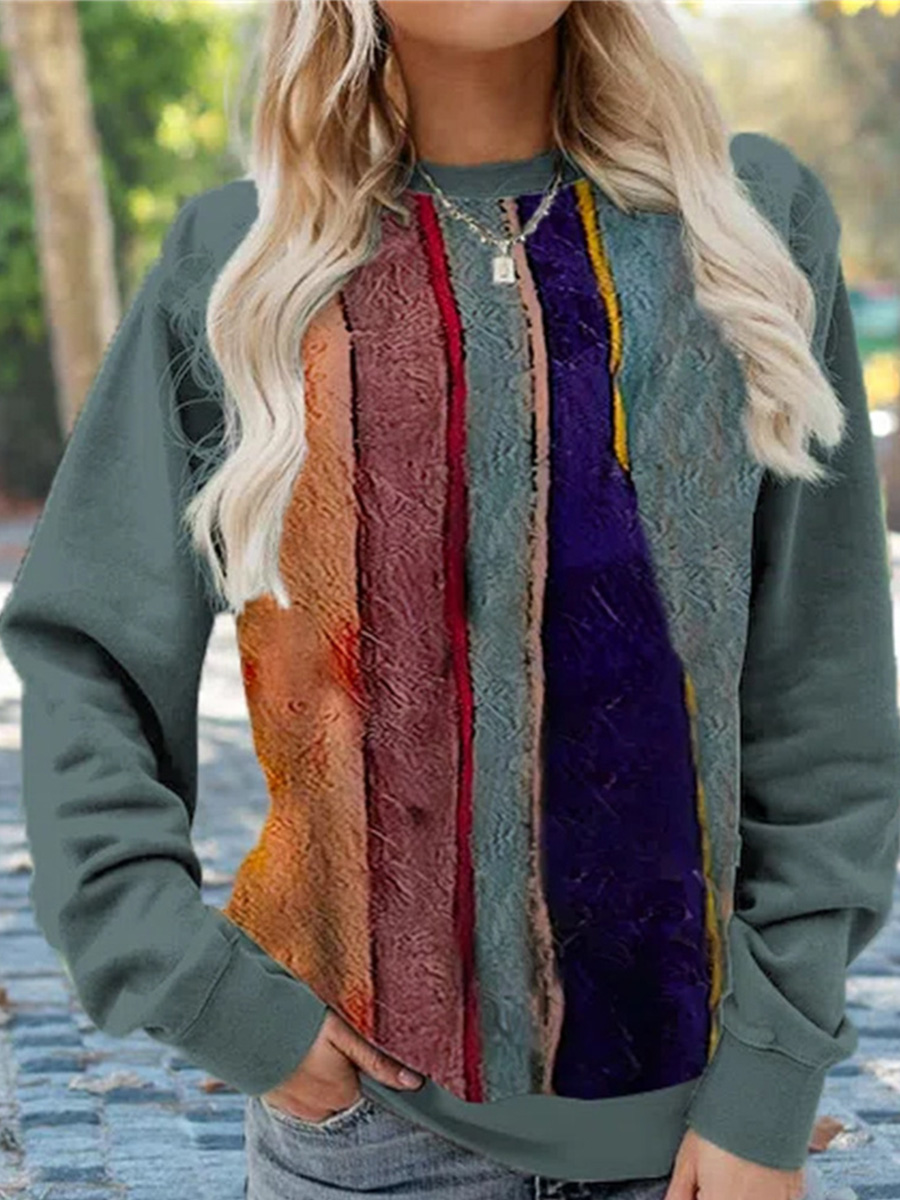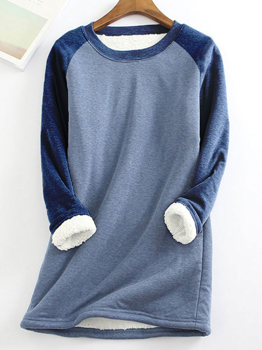 Round Neck Stitching Casual Loose Fleece Long Sleeve T-shirt