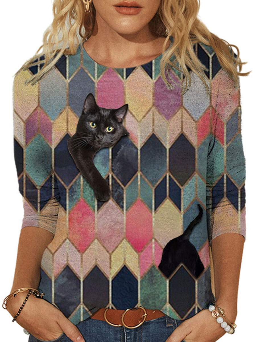 Round Neck Casual Loose Cat Print Long Sleeve T-Shirt