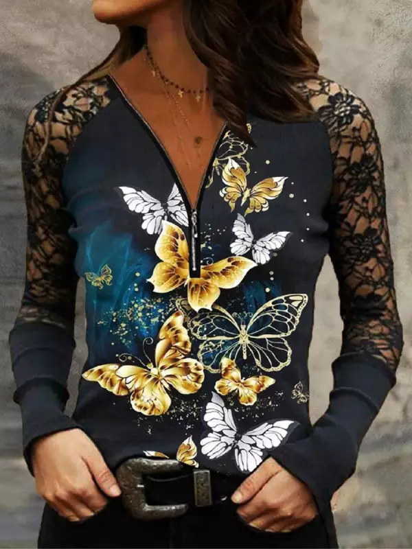 V-neck Zipper Casual Loose Butterfly Long Sleeve T-shirt