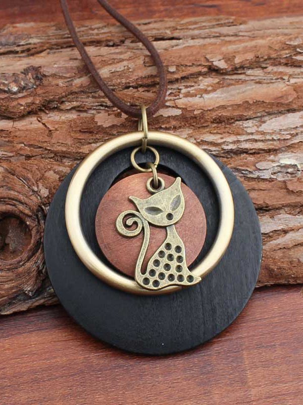 Vintage Wooden Cat Pattern Geometric Pendant Necklace Women Boho Sweater Chain
