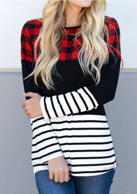 Plaid Splicing Striped O-Neck Long Sleeve Tops