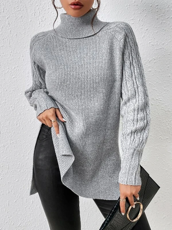 Turtleneck Raglan Sleeve Split Hem Cable Knit Sweater