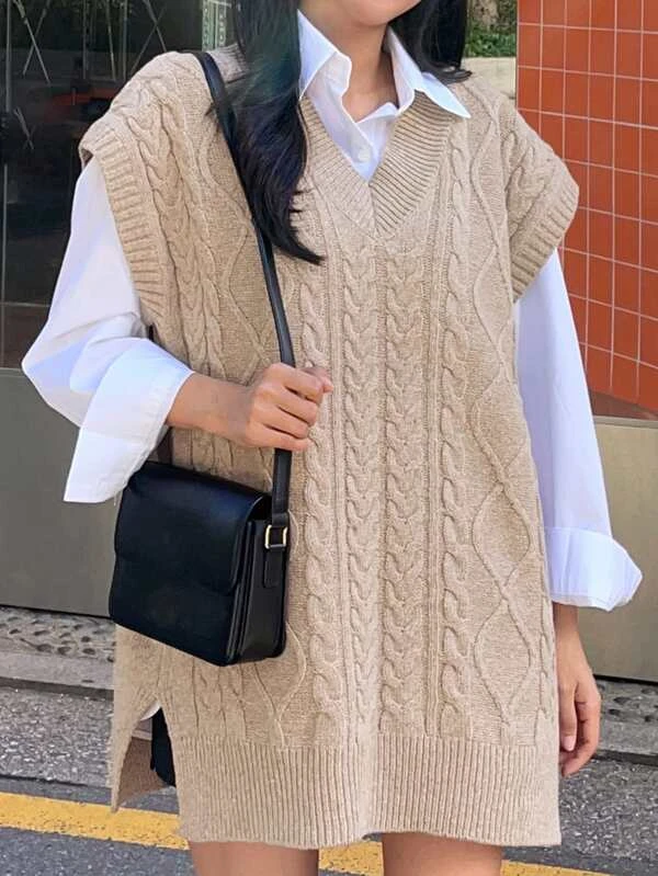 Split Hem Cable Knit Sweater Vest Without Blouse