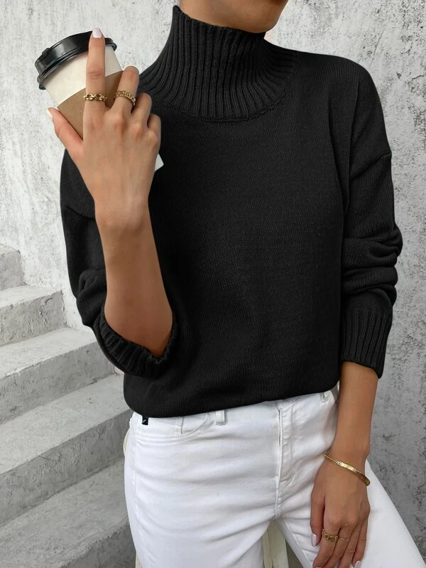 Turtleneck Drop Shoulder Pointelle Knit Sweater