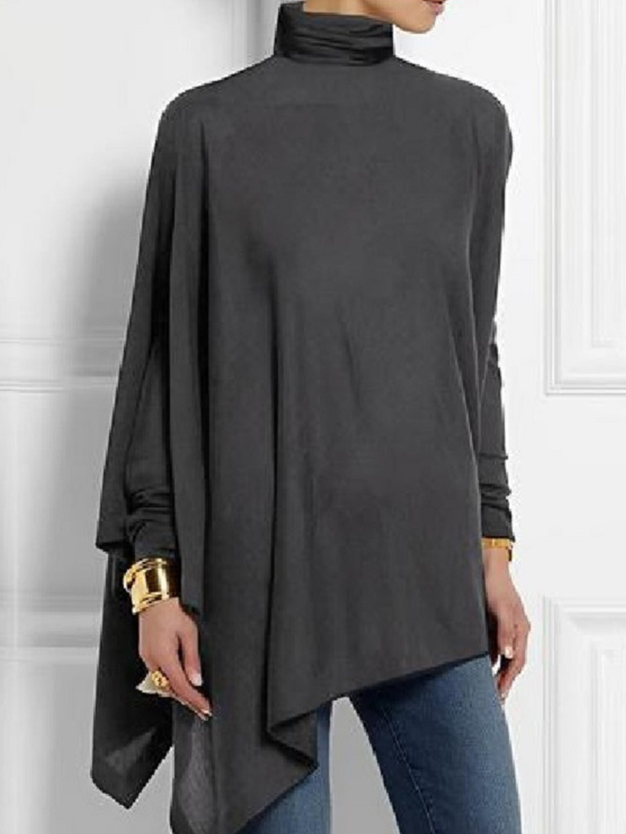 Women Casual Long Sleeves Solid Irregular Turtle-neck T-shirt