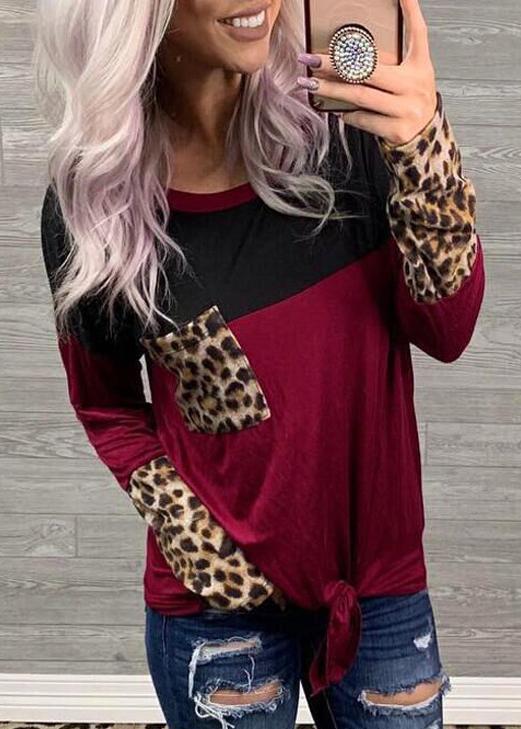 Round Collar Pocket Leopard Splice Long Sleeve T-shirt