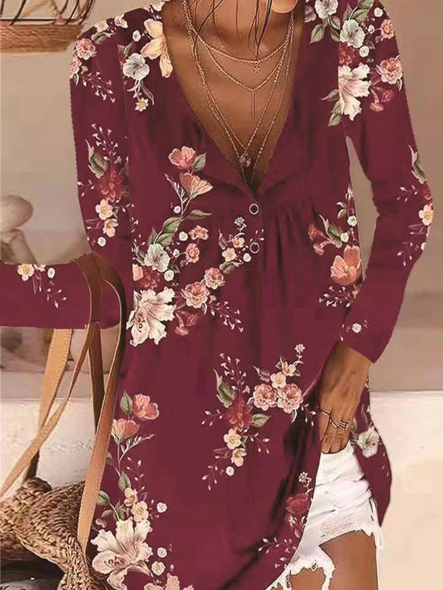 Printed V-neck Button-down Long-sleeved T-shirt