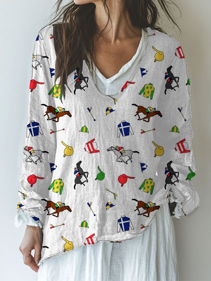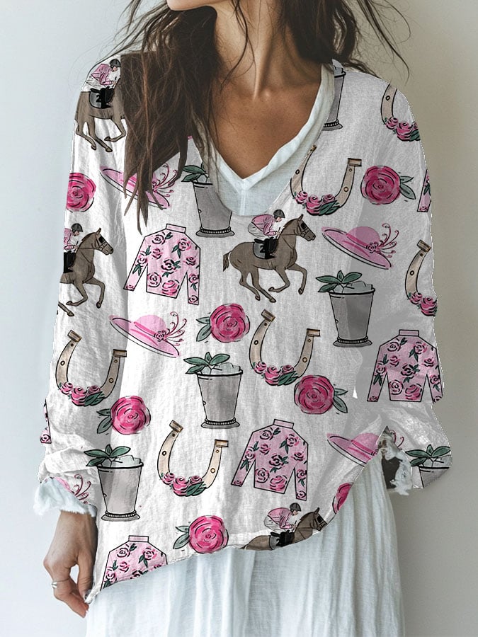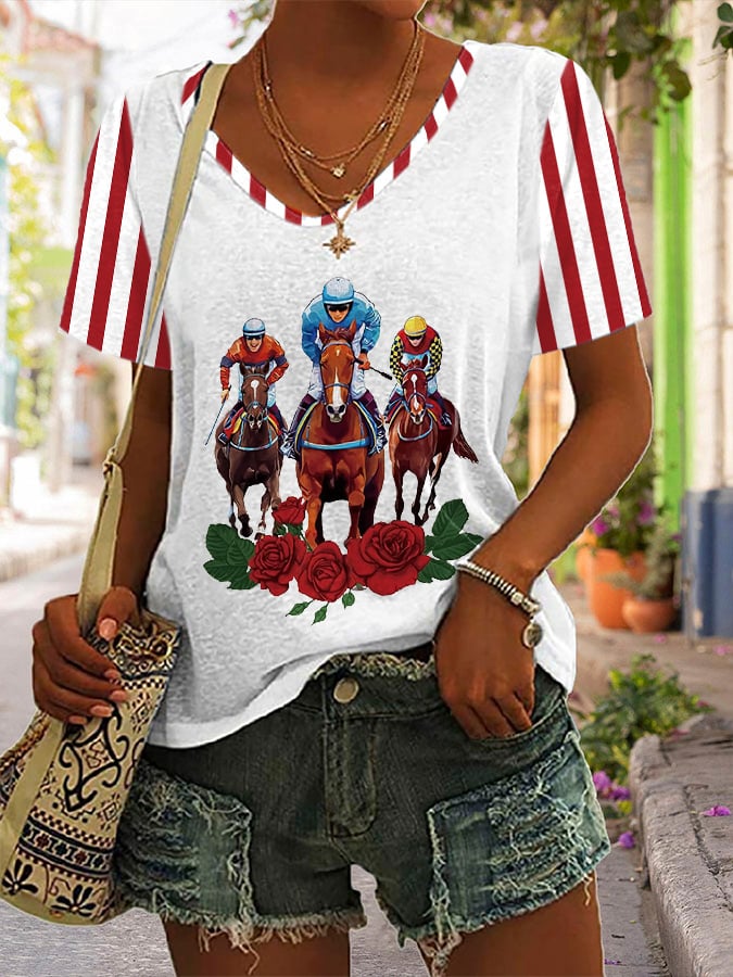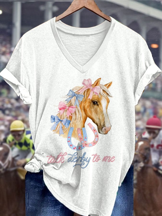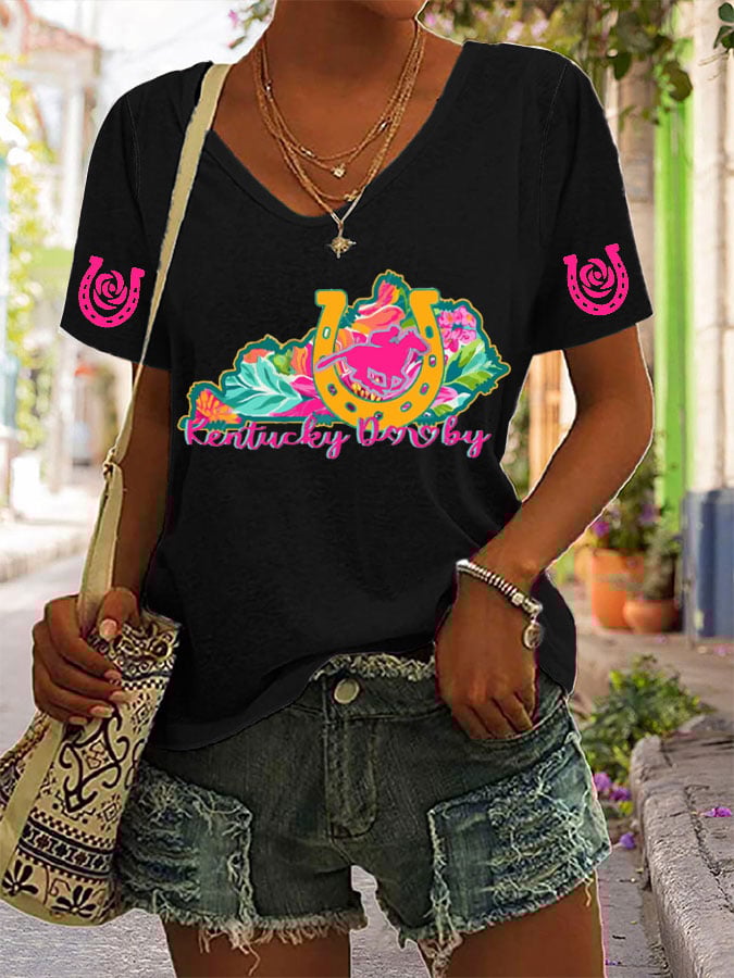 Women’s Retro Kentucky Derby Print V-Neck T-Shirt