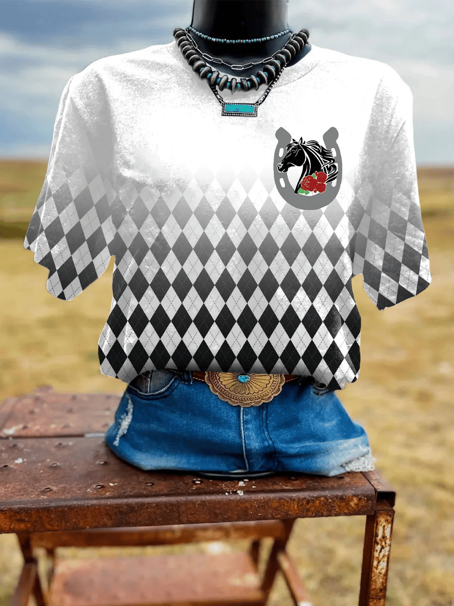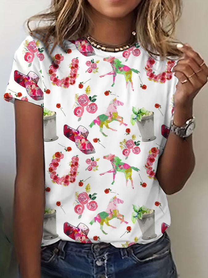 Women’s Retro Kentucky Derby Print Short Sleeve Casual T-Shirt