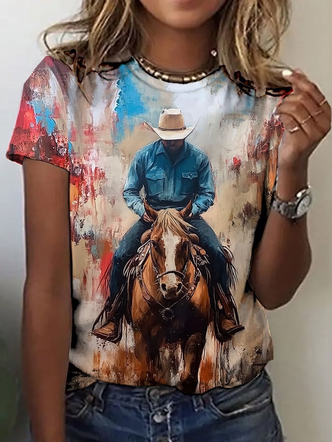 Women’s Retro Riding Print Short Sleeve Casual T-Shirt