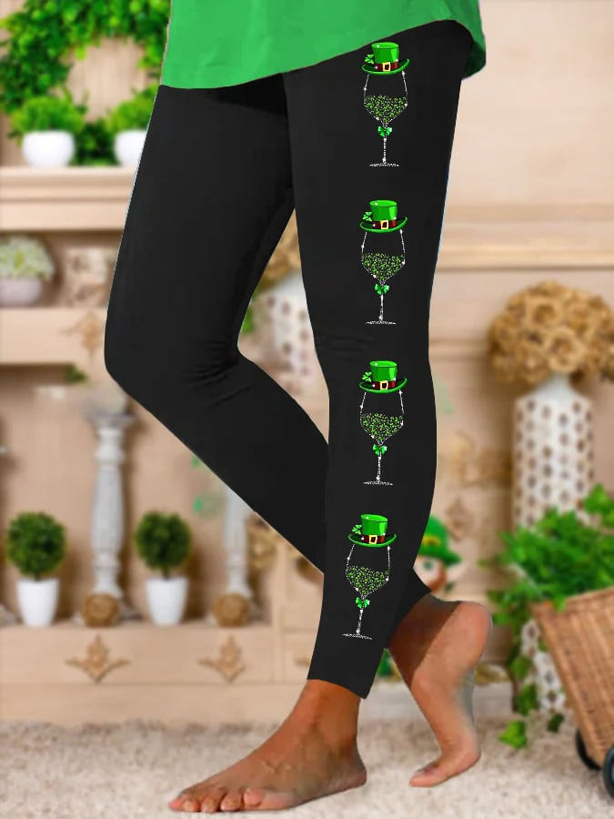 Women's St. Patrick's Day Glitter Wine Glass Print Stretch Leggings