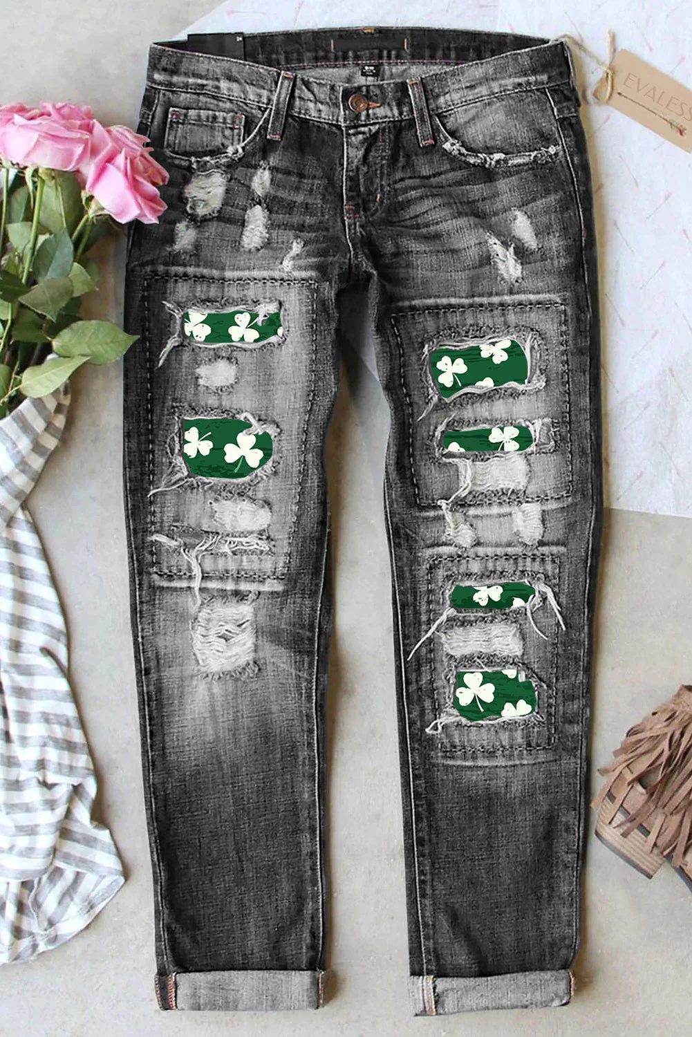 Womens Ripped St. Patrick's Day Clover Denim Pants