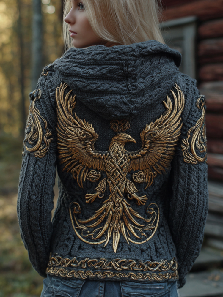 Women's Viking Golden Phoenix Embroidery Navy Blue Vintage Hooded Sweater