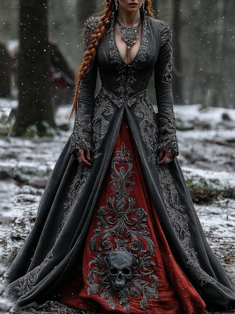 Women's Vintage Viking Skull Embroidery V Neck Casual Maxi Dress