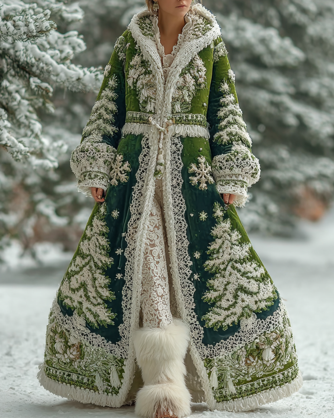 Christmas Themed Fall And Winter Contrast Color Snowflake Embroidered Fur- Collar Coat 6393