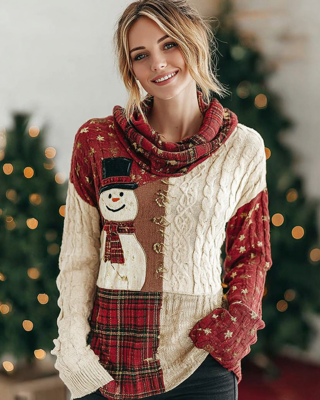 Christmas Themed Contrast Color Patchwork Snowman Embroidered Fur Collar Dress 4478