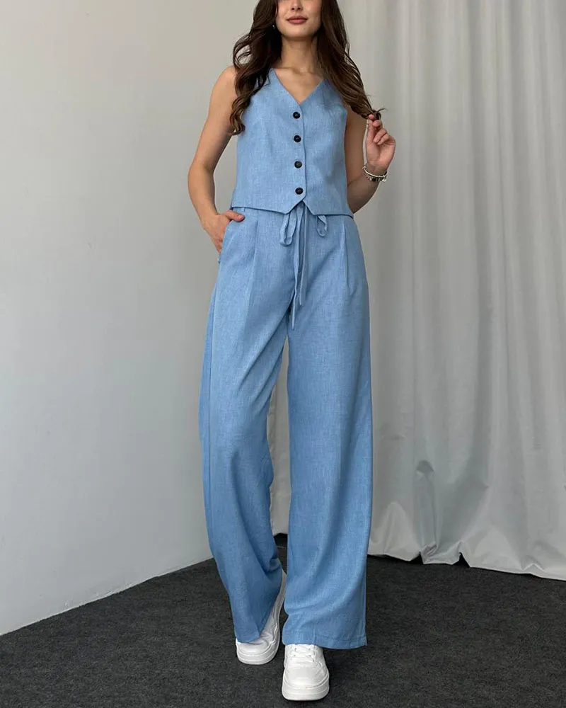 Women's Casual Round Neck Solid Color Side Opening Two Piece Suit