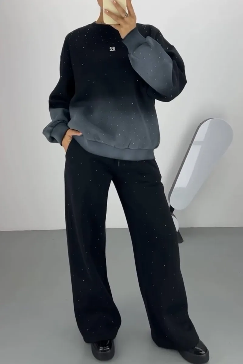 Women's Casual Rhinestone Embellished Ombre Crew Neck Top and Pants Two-Piece Set