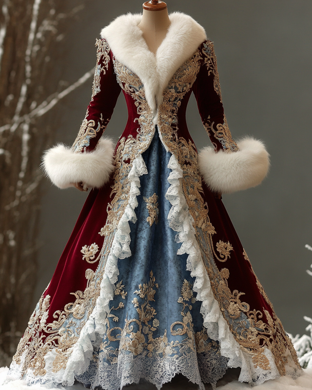 Women's elegant and comfortable Christmas-themed 3D embroidered fur collar warm dress 2072