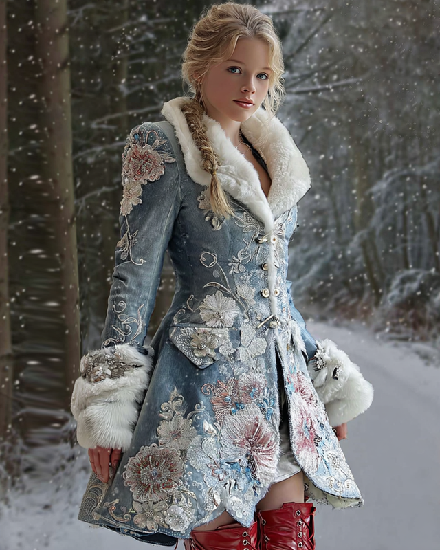 Women's elegant and comfortable Christmas-themed 3D embroidered fur collar warm coat 2527