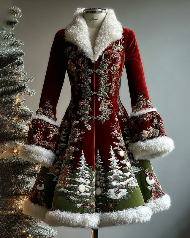 Women's elegant and comfortable Christmas-themed 3D embroidered fur collar warm coat 3407