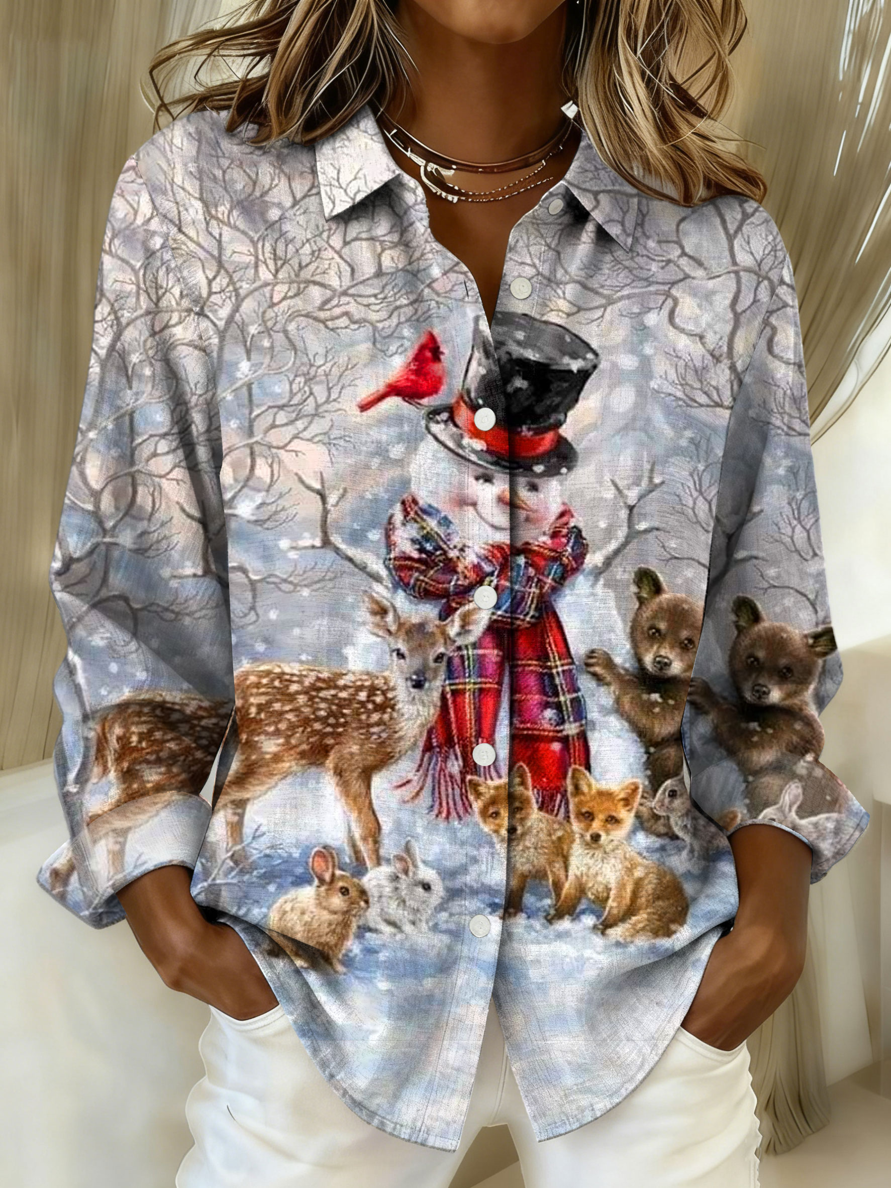 Christmas Animal Art Print Casual Cotton Shirt