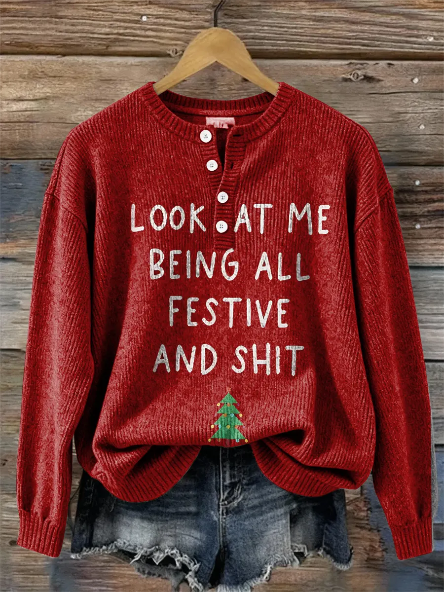 Christmas Look At Me Being All Festive And Shit Print Buttoned Cardigan Sweater