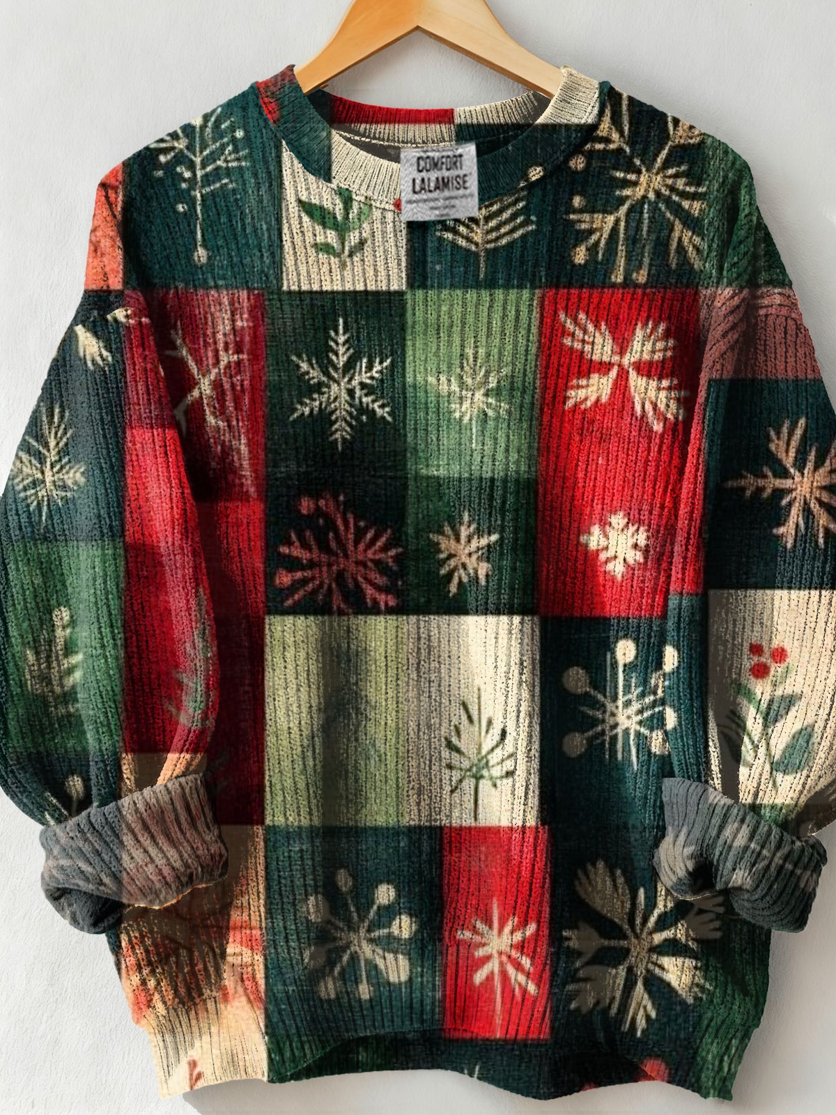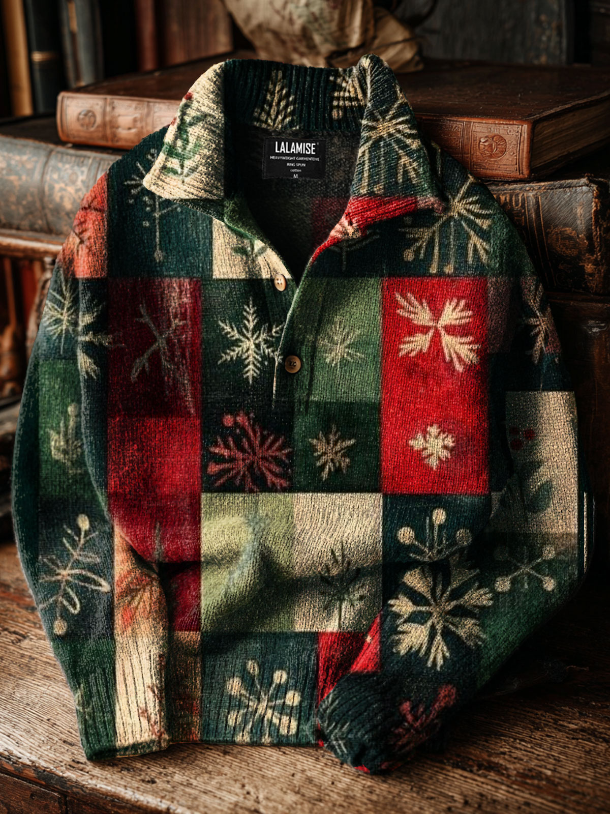 Christmas Patchwork Art Print Button Stand Collar Knit Pullover Sweater