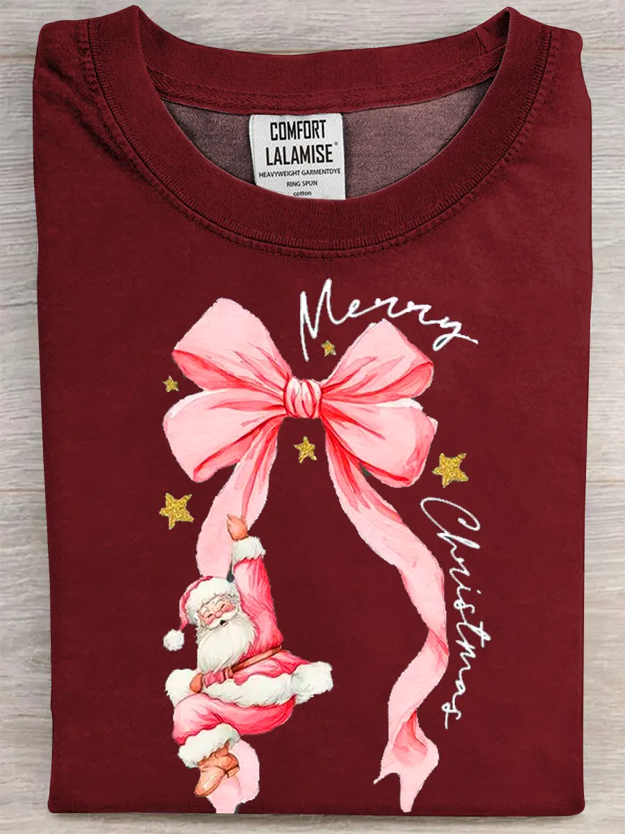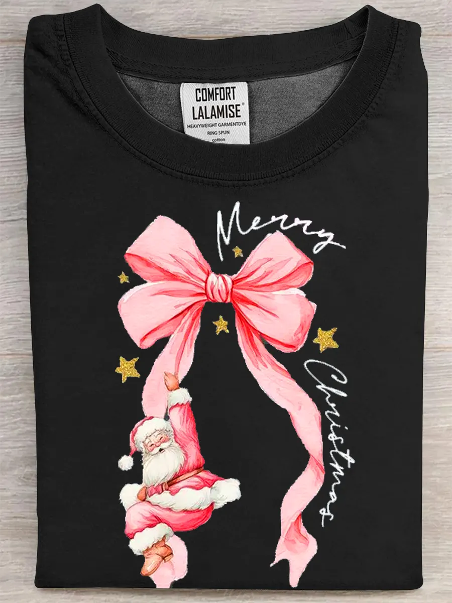 Christmas Pink Bow Santa Claus Art Print Casual Pure Cotton Short Sleeved T-shirt