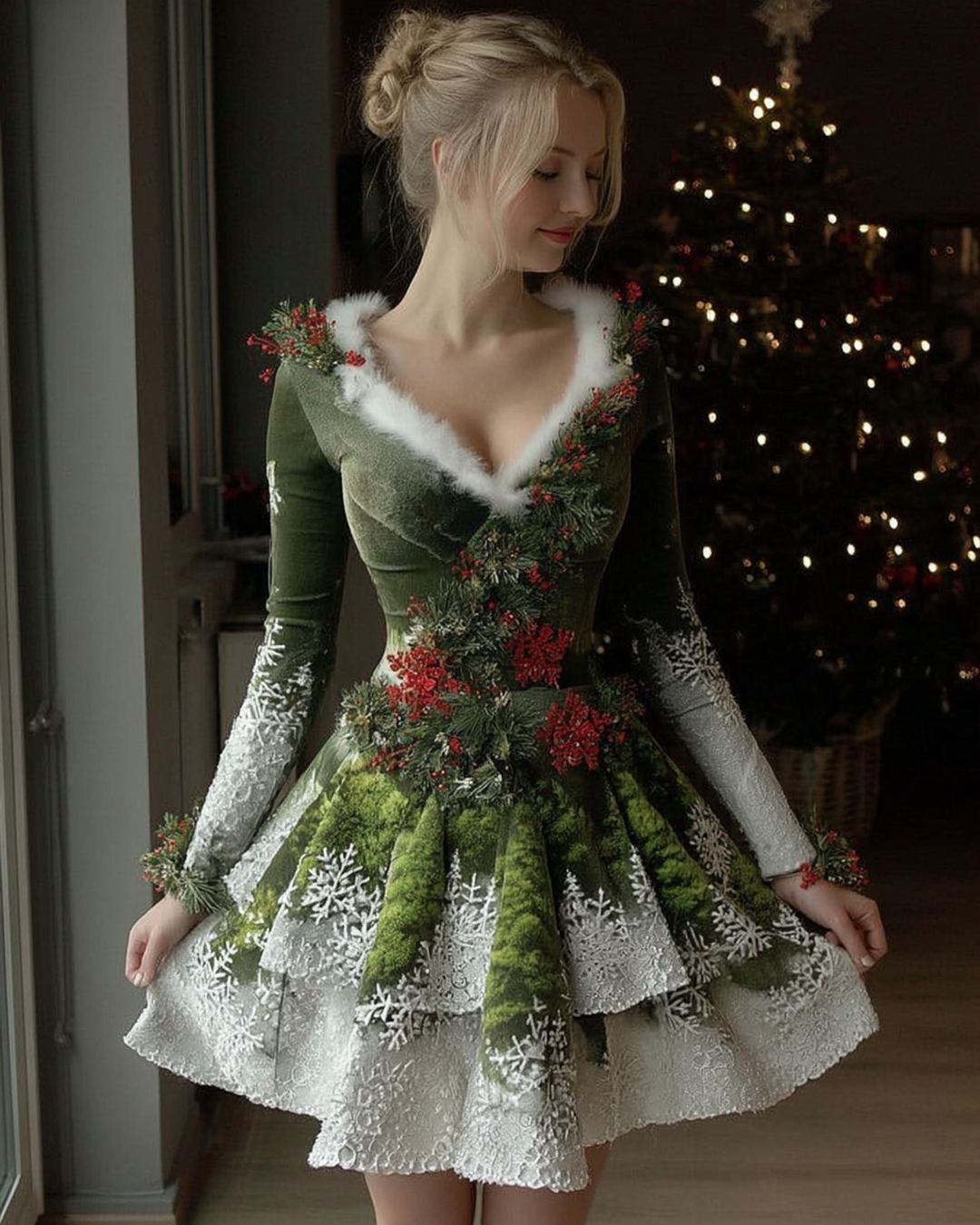Christmas Themed Contrasting Color Christmas Tree Embroidered Velvet Dress 5848