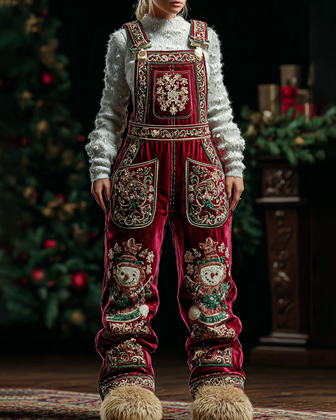 Christmas Themed Snowflake And Snowman Embroidered Pocket Velvet Jumpsuit 1603