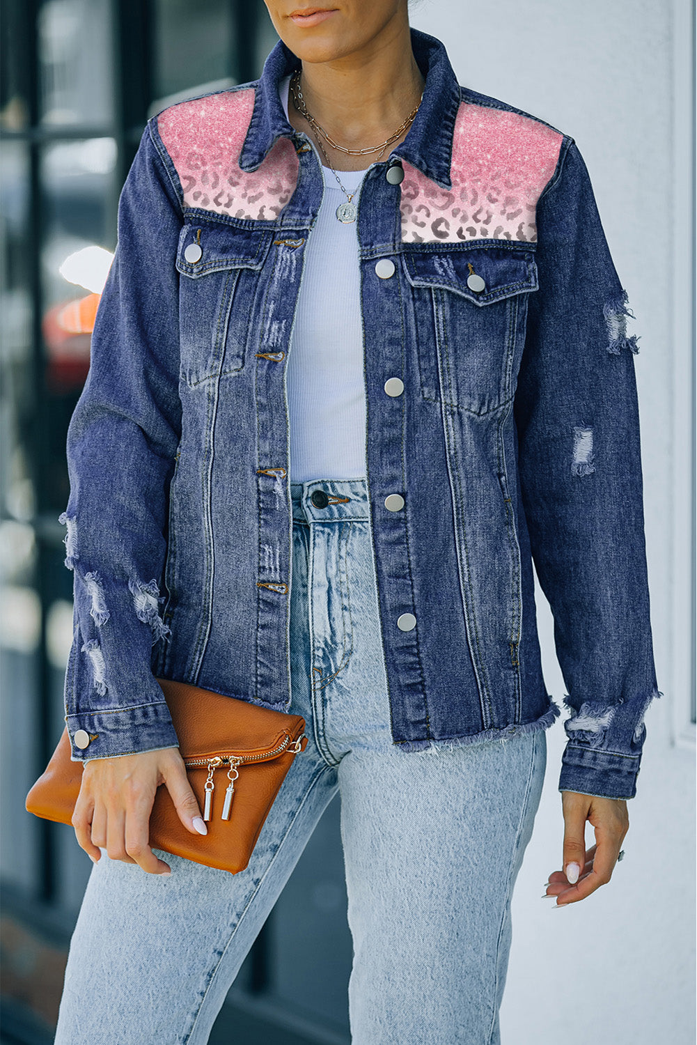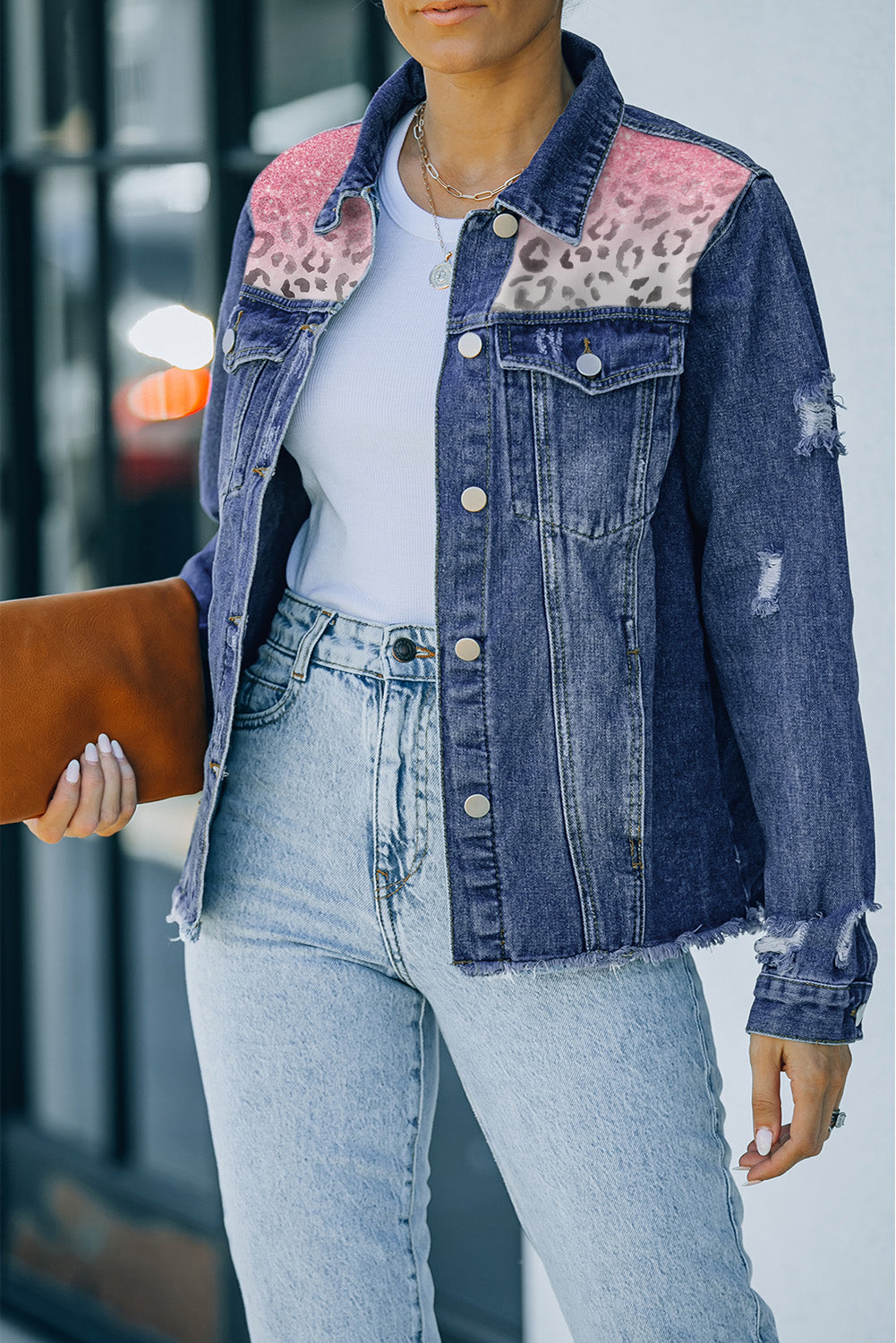 - Get ready for all the compliments in the Leopard Patchwork Raw Hem Distressed Denim Jacket