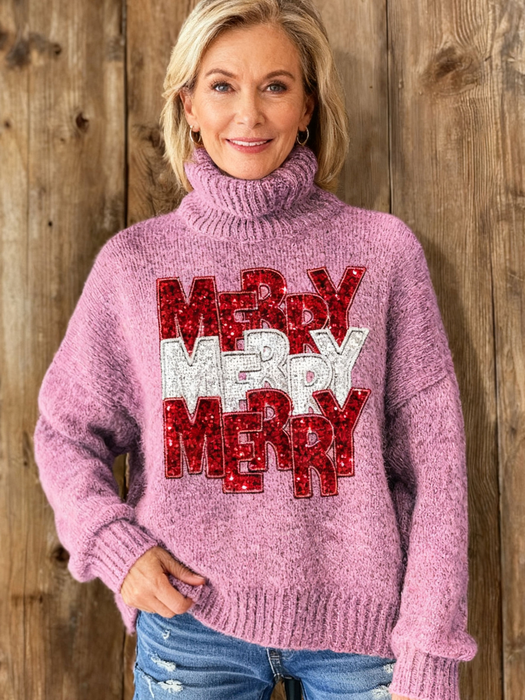Marry Christmas Print Knit Turtleneck Pullover Sweater