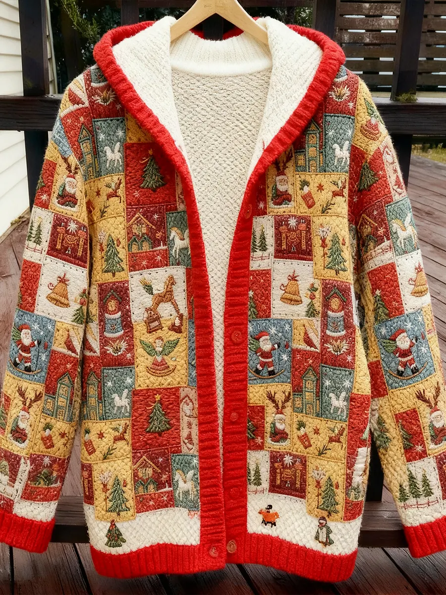 Multicolor Christmas Patchwork Print Button Hood Knit Cardigan Sweater