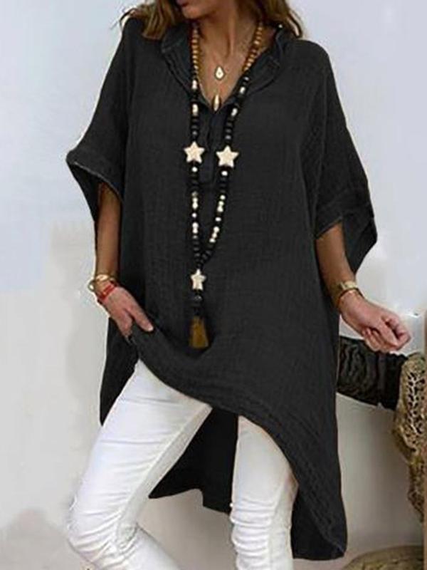 Plain Asymmetric Three-Quarter Sleeve Long Blouse