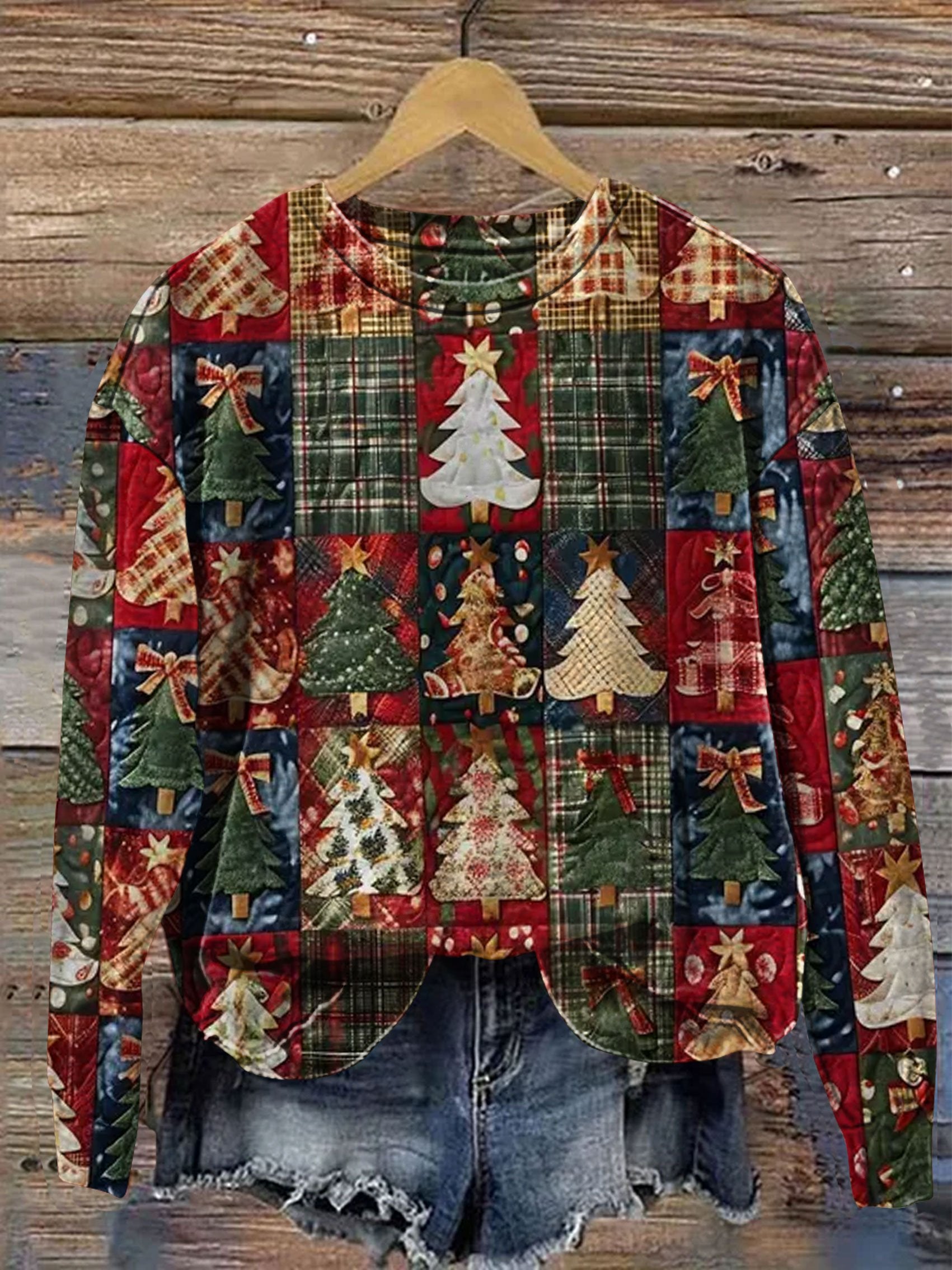 Retro Christmas Tree Patchwork Art Prrint Casual Sweatshirt