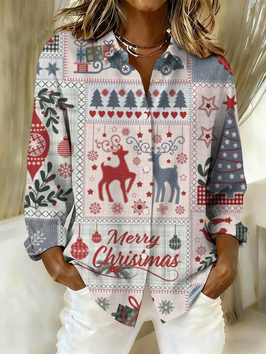 Retro Multicolor Christmas Patchwork Art Cotton Long Sleeve Shirt
