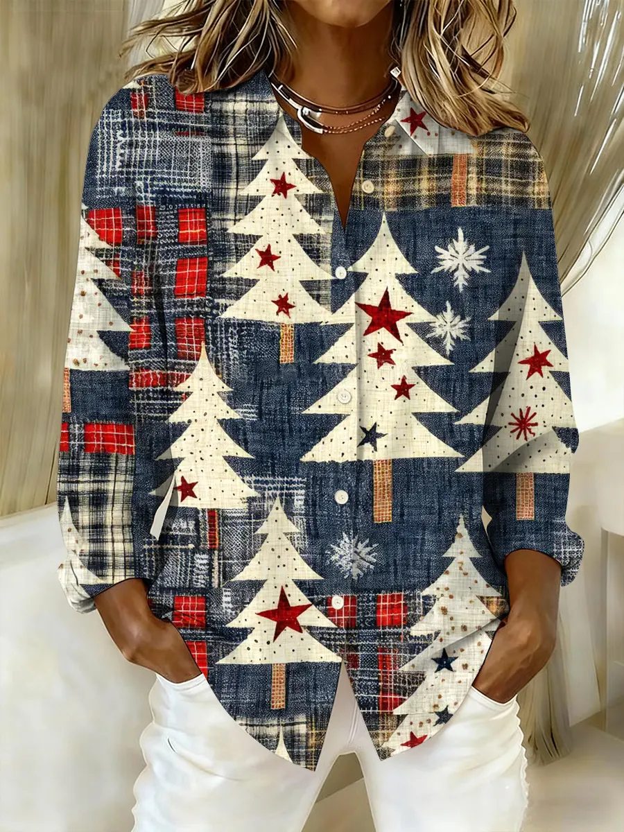 Retro Multicolor Christmas Patchwork Art Cotton Long Sleeve Shirt