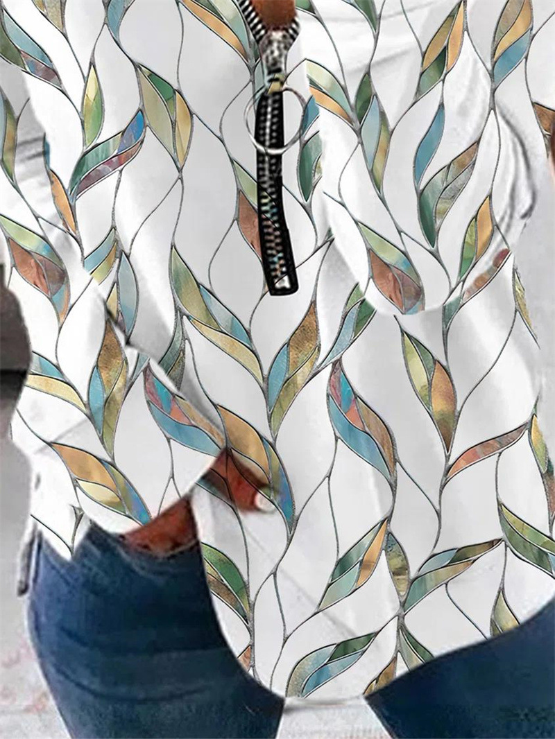Round Neck Zip Casual Loose Leaf Print Sweatshirt