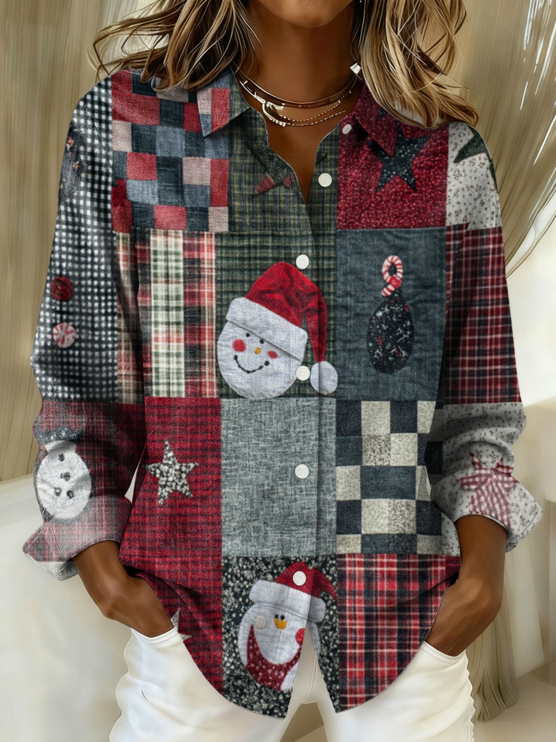 Vintage Christmas Patchwork Art Print Casual Cotton Shirt