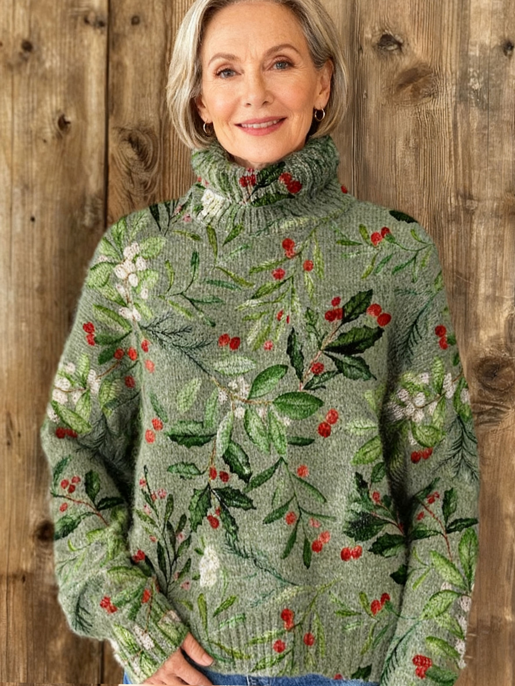 Vintage Christmas Print Knit Turtleneck Pullover Sweater